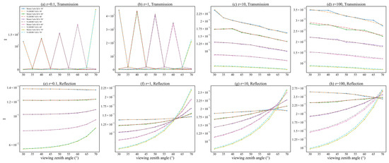Figure 6, Figure A1 and Figure A2 compare the results of Stokes parameter I simulated by the two models for different relative azimuth angles. When the optical depth changes by three orders of magnitude, from 0.1 to 100, consistency is achieved by the two models. The Monte Carlo simulation depends on the number of photons, so as the optical depth increases for cases with larger optical thickness, it is more difficult for photons to pass through one layer to reach the next, with results exhibiting up-and-down oscillation. This can be solved by increasing the number of photons. Although the Monte Carlo results display these oscillations, the order-of-magnitude difference between the two models is within 10−4. Furthermore, as the solar zenith angle increases, the discrepancy between the two models also increases. This is because as the solar zenith angle increases, the assumption of a plane-parallel atmosphere is increasingly unsatisfied, and errors in the models themselves also increase, with different models being more likely to show different results. When the solar zenith angle is between 30° and 60°, the calculation results of two models are generally consistent both for transmissions and reflections.