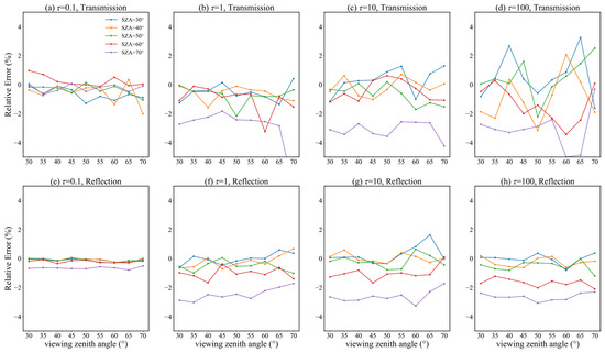 To quantify the errors of the Monte Carlo model, the relative errors were calculated, with the results shown in Figure 7, Figure A3 and Figure A4. For a solar zenith angle of 30–60°, relative errors are most within 2%; for an angle of 70°, errors are larger but still <5%; and for a viewing zenith angle of 40–60°, the relative errors are larger than those of other viewing zenith angles. When the optical depth changes from 0.1 to 100, the overall relative error is within 5%. The statistical metrics’ results were shown in Table 5. For reasons mentioned earlier, the relative errors can be either positive or negative, resulting in inconsistency between relative and absolute relative errors. Regarding the mean relative error, its value was <1% under all optical depth conditions, although the reflection relative error was –1.067% when the optical depth was 50. The mean absolute relative error increased with optical depth, consistent with the characteristics of the Monte Carlo simulation, i.e., the larger the optical depth, the greater the number of photons that were required for the simulation. Although the mean absolute relative error increased with optical depth, the largest error of 1.524% occurred when the optical depth was 100, which is still in an acceptable range. This indicates that the simulation results of the Monte Carlo model are consistent with those of VLIDORT, and, therefore, could be used for subsequent radiative transfer simulations.