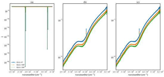 Simulation results for the radiation field at 50 km, for (a) the 1800–4000 cm−1 band; (b) the 25,000–55,000 cm−1 band, using the normal-temperature database; and (c) the 25,000–55,000 cm−1 band, using the high-temperature database. ‘RAA’ represents the relative azimuth angle.