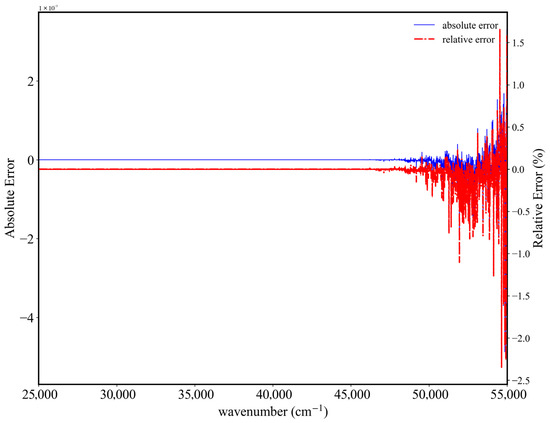 Plots shown in Figure 2 indicate that, under given conditions, there were significant differences in absorption coefficients calculated using HITRAN and HITEMP databases at 360 K, 500 K, and 1000 K, because HITEMP uses more line data including weak transitions. This also leads to the large relative errors in Figure 2b. However, in actual applications, Schroder et al. [44] point out that the HITRAN database is relatively accurate for temperatures below 1300 K. For the near-IR band, HITRAN generates fewer line shapes and intensity prediction errors than HITEMP. Considering that the atmospheric profile used in this study did not consider water vapor at temperatures above 1000 K, only the HITRAN database was used in calculating absorption characteristics in the IR band.