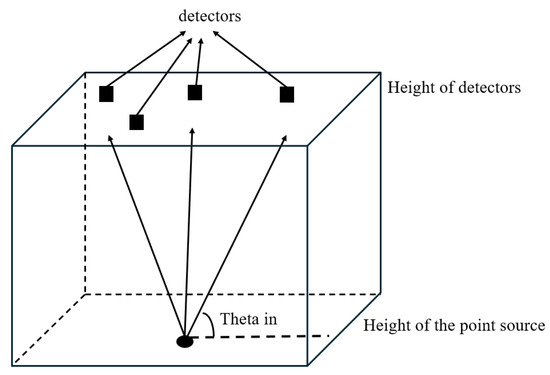 The Monte Carlo model achieves the radiative transfer simulation with point sources by placing detectors at different heights. The geometric observation parameters were consistent with the 1D simulation, as shown in Table 4. A total of 25 detectors were placed in a 5 × 5 pattern, evenly distributed on boxes [−10.5, 10.5] of the X and Y axes. The effective Muller matrix of the detector in the Monte Carlo model is the result of projection of the scattering direction at specific detectors, so its calculation result with point sources is much smaller than the ones with solar sources. Figure 12 shows a schematic diagram of the transmission process in the 3D situation. In this process, photons are emitted from the height of the point source and, after undergoing the absorption and scattering processes in the atmosphere, they, finally, reach the height of the detectors. The detectors are uniformly distributed on the horizontal plane at the height, and in this case a total of 25 detectors are used.