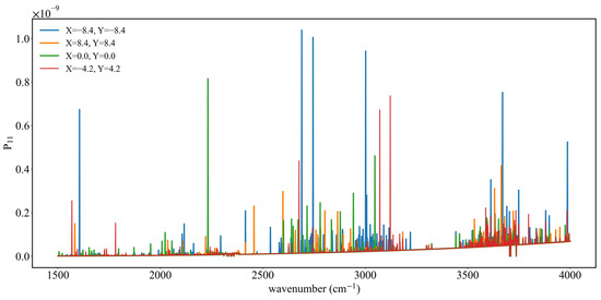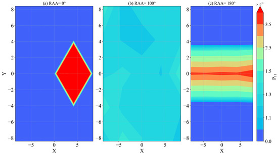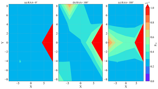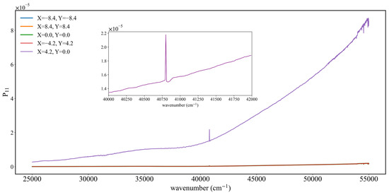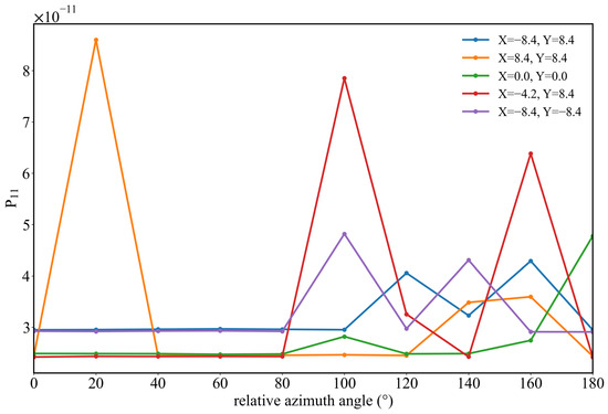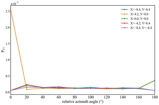 Figure 16, Figure 17 and Figure 18 present the results of the simulations with point sources in 25,000–55,000 cm−1, where results show certain differences from those of the IR band. As shown in Figure 16, when the relative azimuth angle is 0°, there is a maximum value at the detector coordinate (4.2, 0), and radiation values at other positions show little variation; with an angle of 100°, all P11 values in the entire region lie in the range (1–2) × 10−6; while at 180° there is a decreasing trend towards both sides along the axis Y = 0 with a characteristic stratification. In the IR band, the variation of P11 with wavelength is obvious, but in the UV band there is a high degree of consistency at different detector positions, with a large difference only at the coordinate (4.2, 0.0). In Figure 17, the variation of P11 at different detector positions with the relative azimuth angle is similarly not obvious, with an abrupt change only at the coordinate (4.2, 0.0) when the relative azimuth angle is 0°. With other detector positions and relative azimuth angles, values of P11 are all in the range of (0–5) × 10−6.