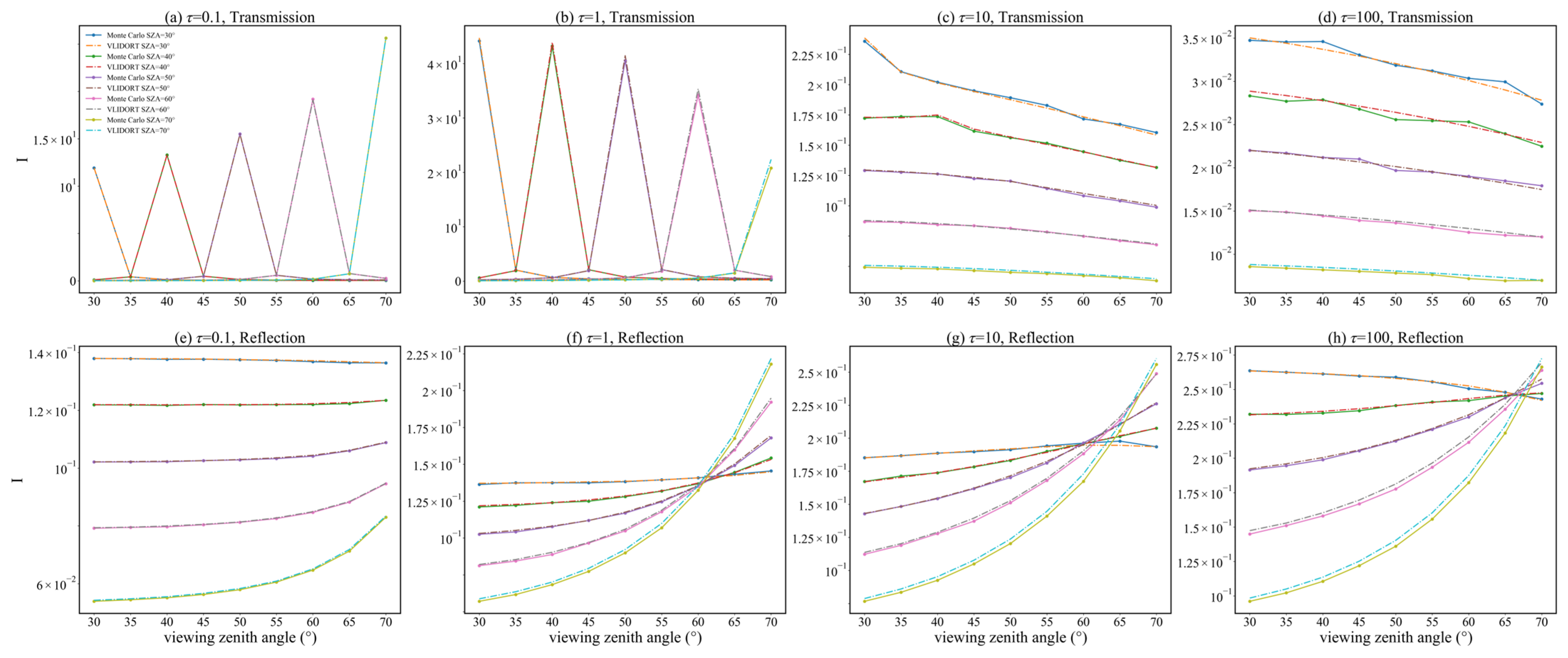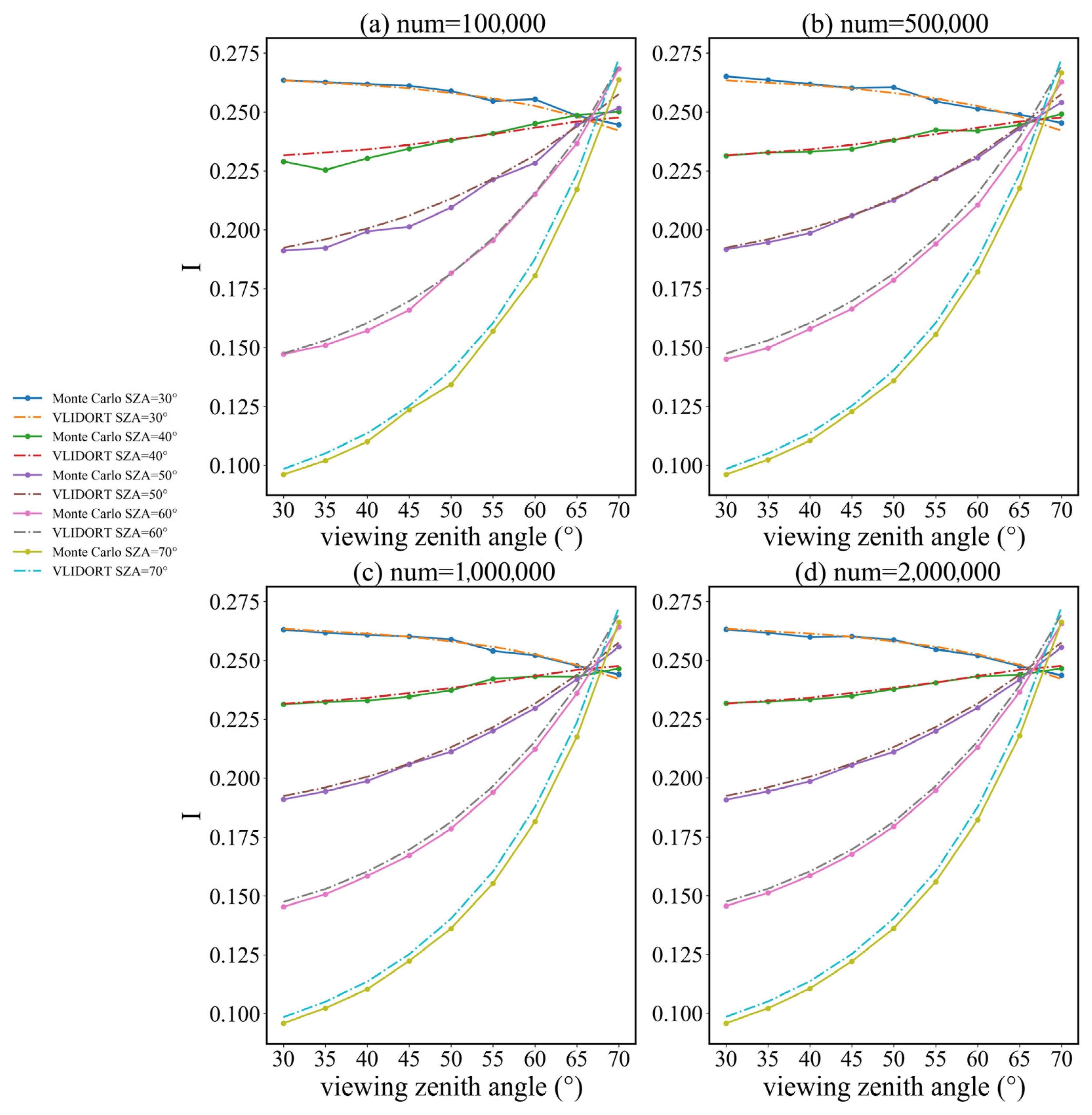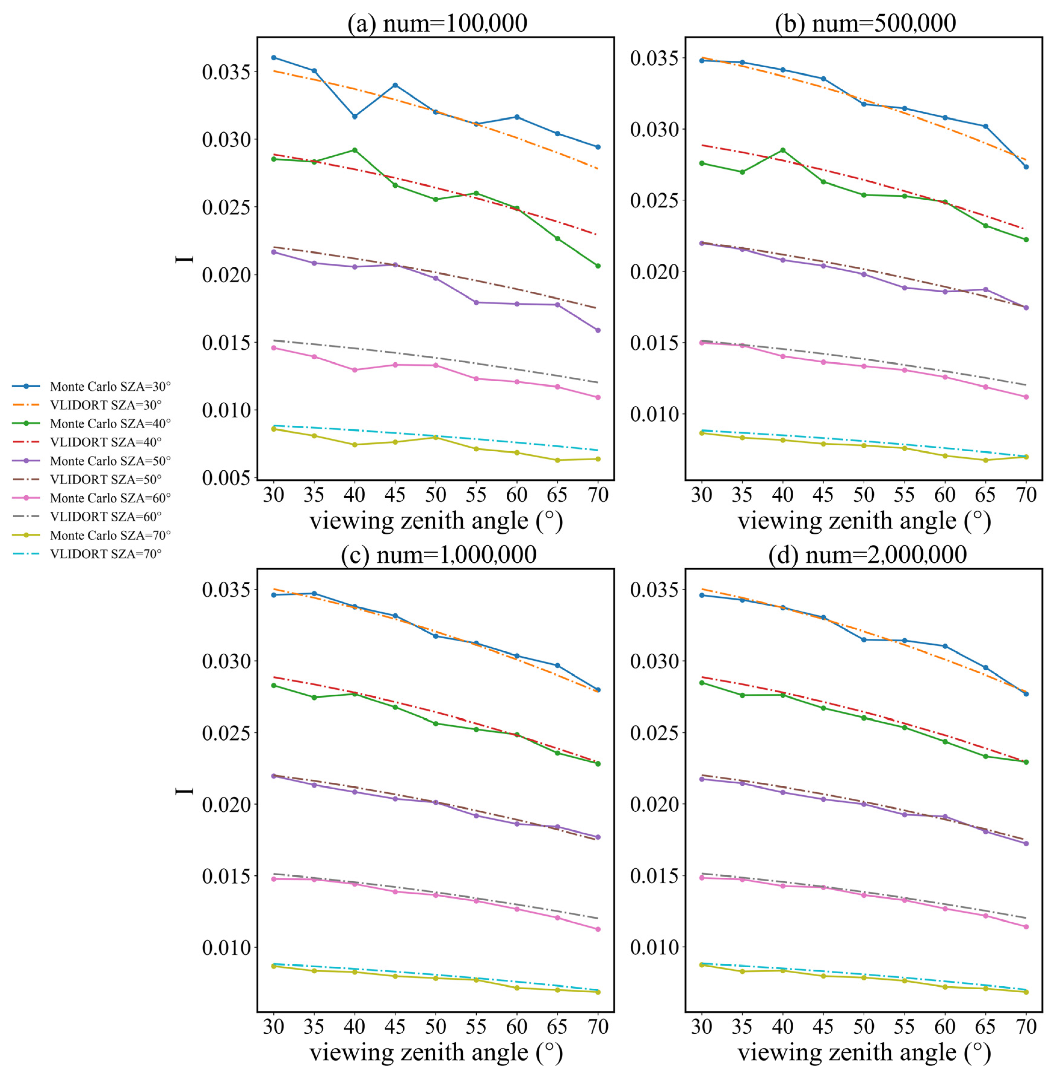 3.1. Comparison of the Monte Carlo and VLIDORT Approaches
