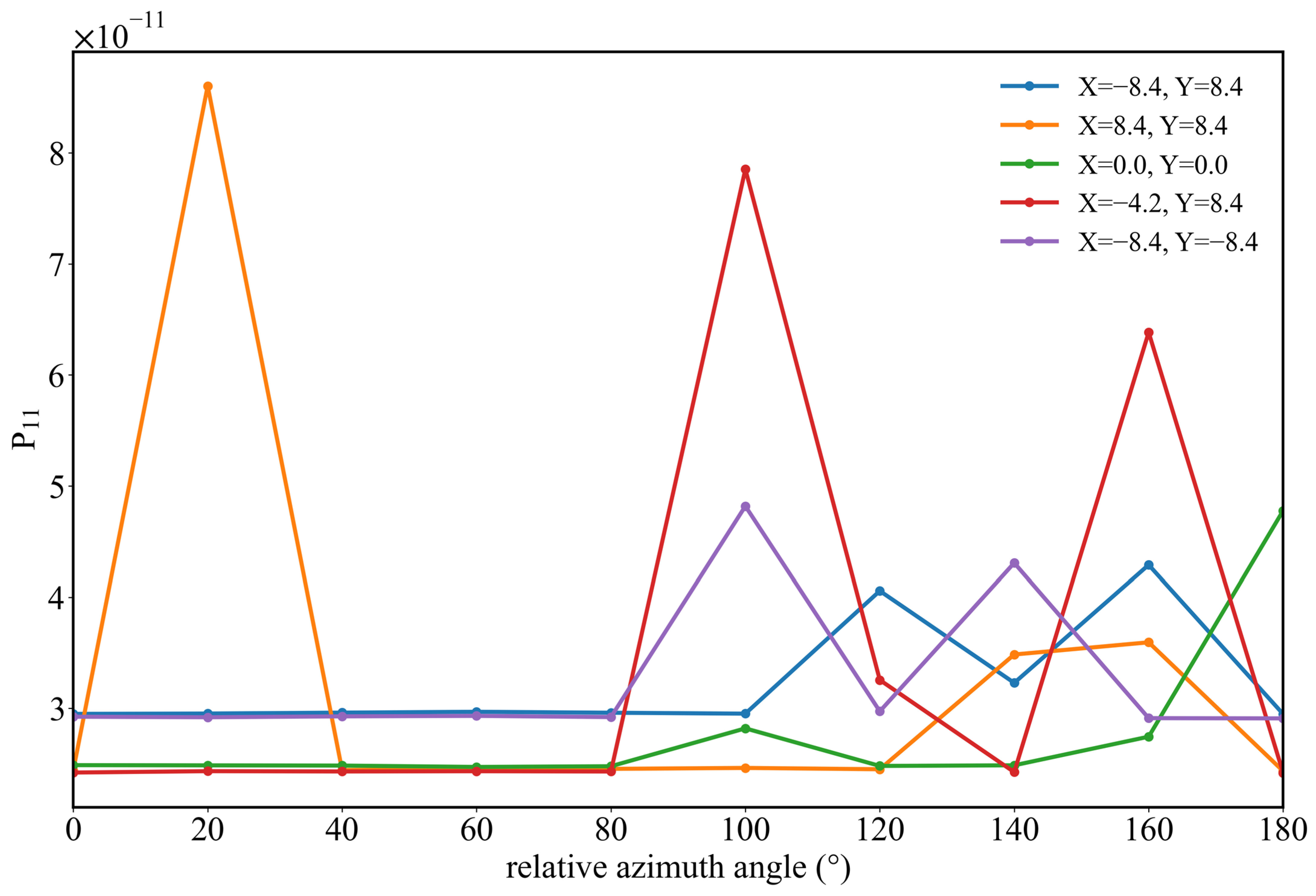 Relative azimuth angle | Relative azimuth angle | 0°, 20°, 40°, …, 180° |