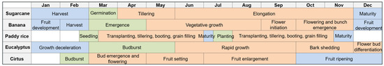 In Fusui County, sugarcane is typically planted in early March and harvested intensively between January and February of the following year. The growth cycle of sugarcane consists of several distinct phenological stages: germination, tillering, elongation, maturity, and harvest. Germination typically begins in March, when the primary buds sprout and develop into young seedlings. From April to May, the crop enters the tillering stage, characterized by the emergence of multiple lateral shoots. Between June and November, sugarcane enters the elongation stage, marked by rapid culm growth, significant leaf expansion, and vigorous photosynthetic activity. By December, the crop reaches the maturity stage, during which sucrose accumulation in the stalks accelerates. The harvest period usually occurs in January and February, when sucrose concentration peaks and most leaves have senesced. Citrus, as a perennial evergreen fruit tree, retains its foliage year-round, with fruit ripening peaking between November and December. Banana is typically transplanted from February to March and harvested from November to December. Eucalyptus, an important plantation species in southern China, is a fast-growing tree with a dense canopy and strong adaptability to a range of environmental conditions. Paddy rice in the region follows a double-cropping system. Early rice is transplanted in early March and harvested by mid-July, while late rice is sown in late July and harvested by late November. Figure 2 visualizes the phenological progression of primary crops in Fusui County.