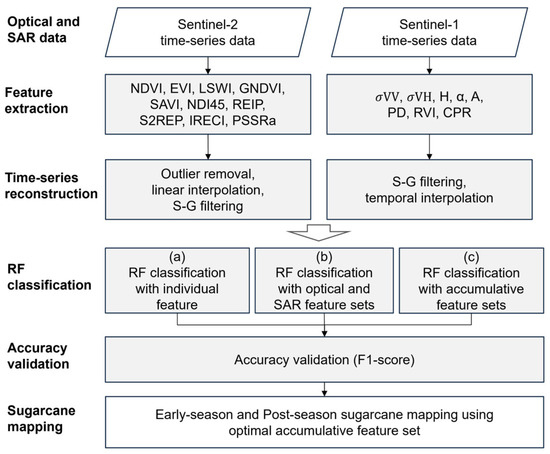 The methodological framework of this study for early-season sugarcane identification comprises four main components: (1) feature extraction from Sentinel-1 and Sentinel-2 remote sensing data, (2) time-series reconstruction to mitigate data gaps and noise, (3) sugarcane identification using random forest (RF) algorithm with various feature inputs, and (4) accuracy assessment of the identification results (Figure 3).