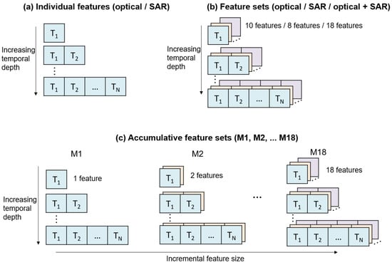 RF classification with three groups of feature inputs and incremental temporal observations. (a) Individual features from optical and SAR data, (b) Optical feature set, SAR feature set, integrated optical–SAR feature set, (c) Accumulative feature sets containing M1, M2, … M18.