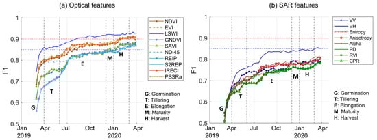 F1-score variations throughout each phenological stages for individual optical and SAR features. (a) Optical features: NDVI, EVI, LSWI, GNDVI, SAVI, NDI45, REIP, S2REP, IRECI, PSSRa. (b) SAR features: VV, VH, entropy, anisotropy, alpha, PD, RVI, CPR.