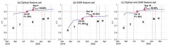 F1-score variations throughout phenological stages for three feature sets: (a) optical feature set, (b) SAR feature set, (c) integrated optical–SAR feature set. G—germination; T—tillering; E—elongation; M—maturity; H—harvest.