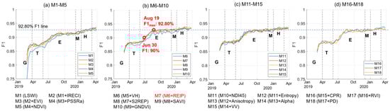 F1-score variations across phenological stages using accumulative feature sets. These 18 feature sets are shown separately in 4 subfigures. (a) M1–M5, (b) M6–M10, (c) M11–M15, (d) M16–M18. G—germination; T—tillering; E—elongation; M—maturity; H—harvest.