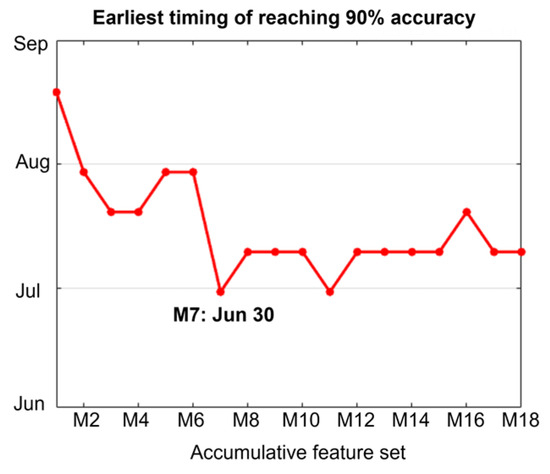 Earliest timing of reaching 90% accuracy under M1-M18 feature sets. Among the M1–M18 feature sets, M7 (LSWI, IRECI, EVI, PSSRa, NDVI, VH, REIP) achieved 90% accuracy earliest—by 30 June—demonstrating the best performance across all evaluated feature combinations.