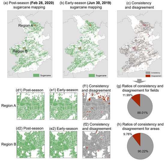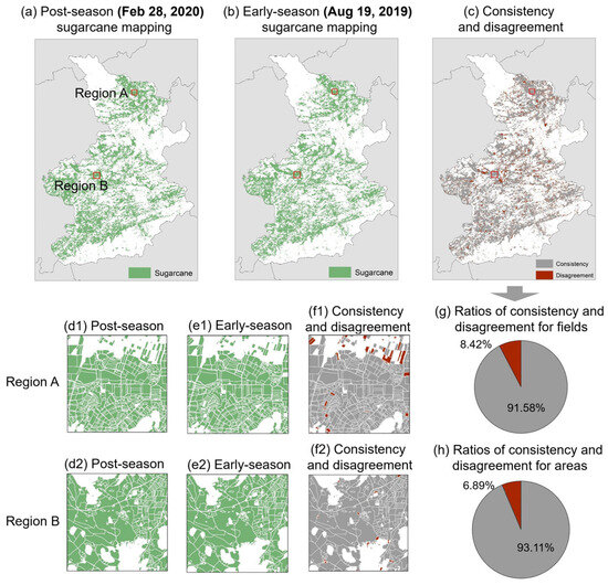 Comparison between post-season (28 February 2020) and early-season (19 August 2019) sugarcane mapping in Fusui County. (a,b) Post-season and early-season sugarcane mapping, respectively. (c) Consistency and disagreement. (d1,d2) Post-season sugarcane mapping in Region A and Region B, respectively. (e1,e2) Corresponding early-season mapping results. (f1,f2) Consistency and disagreement for Region A and Region B. (g,h) Statistics for the consistency and disagreement of the post-season and early-season mapping for fields and areas, respectively.