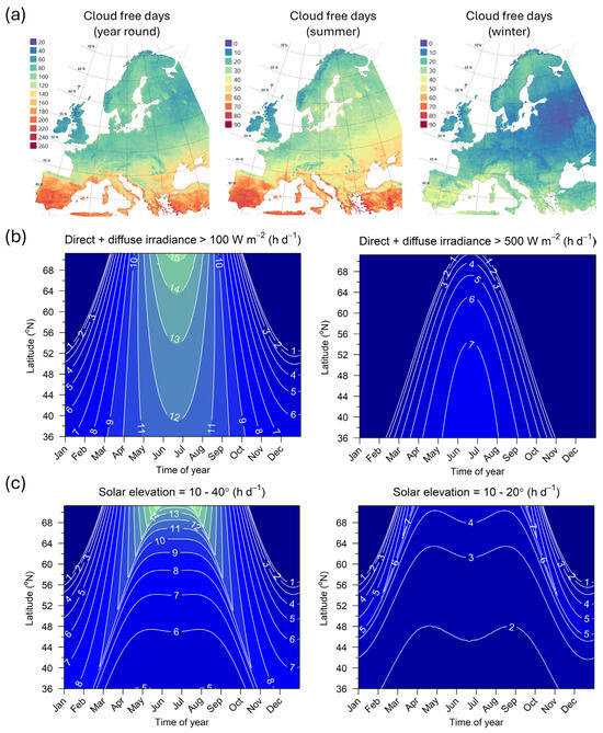 Optimal window length for UAV imaging across Europe: (a) cloud-free days; (b) hours per day with solar irradiance > 100 and >500 W m−2; (c) hours per day when solar elevation is 10–40° and 10–20°. See Figure 4 for data sources.