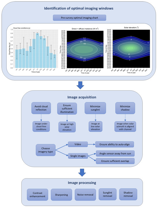 After identification of optimal imaging windows, surveys can be planned so that imagery is obtained at a time when the likelihood of adverse light conditions are minimized. Based on site location, calculated solar positions can be used to ensure surveying occurs at sufficient irradiance levels, with minimal sunglint and shadow. This will influence the time of optimal imaging, both within the year (e.g., winter may be unsuitable for northern locations) and within the day (noon at summer may be unsuitable for southern locations). Attention should also be paid to how river orientation with respect to surrounding topography and riparian vegetation impacts on the light environment (see [26]) so that surveys are acquired at an appropriate solar azimuth. In the days leading up to surveying, short-term weather forecasts can be used to focus planned surveys towards days or hours when cloud-free conditions are expected.
