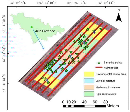 Under natural conditions, a soil moisture gradient hardly forms under typical experimental conditions. Therefore, we designed a control experiment to irrigate the bare soil area of the farmland to varying degrees artificially, creating a moisture gradient (see the experimental area shown in Figure 1). Three experimental zones (zones 1–3) were designed and set up, each with a rectangular shape of 30 m × 30 m. Approximately 12, 24, and 36 tons of water were poured to produce low, medium, and high soil moisture gradients. In addition, the surrounding environmental zones, zone 0 and zone 4, were employed as control zones, resulting in four moisture gradients. The watering work was carried out the day before the experimental measurement, and the infiltration was carried out after one day of standing to ensure a more uniform distribution of moisture on the soil surface. Foam-absorbing materials and color boards were placed at the corners of the experimental area as ground control points.