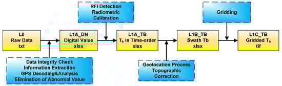 A data processing method (Figure 4) considering topography and angle correction was applied in this study [36] which processed the raw data obtained by the drone-borne passive microwave observation system into raster data for subsequent inversion use. The data processing method mainly included seven processes: (1) data extraction, (2) data selection, (3) radiometric calibration, (4) radio frequency interference detection and suppression, (5) GPS interpolation, (6) space projection, and (7) gridding and generating a preview map of the brightness temperature spatial distribution. Note that the TBs in Figure 4 refer to the brightness temperature, and the terms txt, xlsx, and tiff are the data formats at each stage.