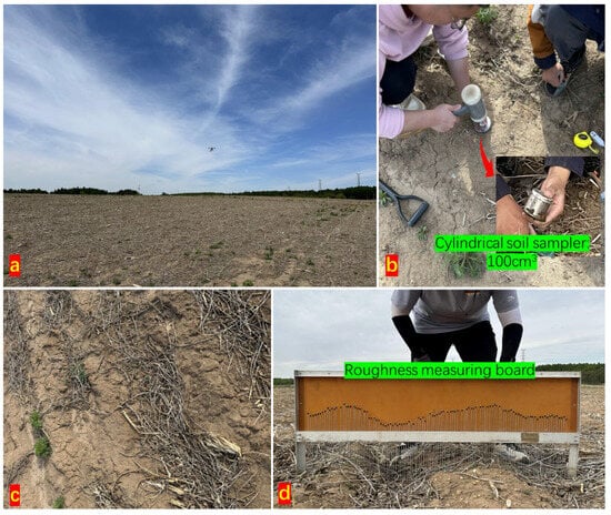 The multi-spectral lens of the drones was employed to obtain the multi-spectral data of the area. The ridge structure parameters, which describe the geometric parameters of the ridge structure, including the ridge height, ridge spacing, and ridge width, were measured using tape measures and rulers in the field. The surface roughness of the soil was measured with a roughness board. Soil samples were collected at the observation points, as marked by the green stars in Figure 1. All raw data were organized to form scientific data and applied for subsequent inversion research.