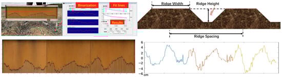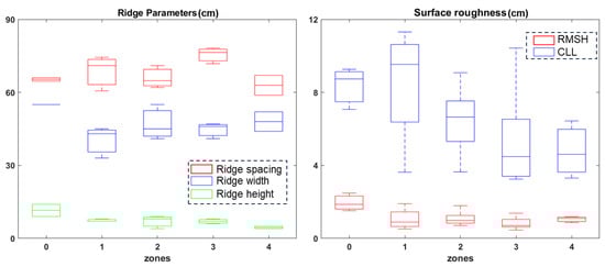 The measurement results of the ridge structure parameters and the surface roughness are shown in Figure 9. The ridge spacing, ridge height, and ridge width are distributed between 65 and 80 cm, 4 and 10 cm, and 45 and 55 cm, respectively; The RMSH and CLL are distributed at 0.5–2 cm and 4–10 cm, respectively.