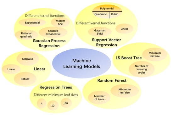 Extensive research on several machine learning algorithms and their applications has been conducted. However, selecting the right algorithm for certain applications has proven challenging [49]. Thus, in this study, commonly employed machine learning models, including linear, regression tree, support vector regression (SVM), Gaussian process regression (GPR), boosted tree, and random forest (RF), were applied to compare their performances and choose a suitable model. Each model will undergo a certain degree of parameter adjusting, as shown in Figure 7, to achieve the best accuracy.