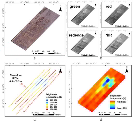 The experimental area was a rectangle with a dimension of 170 m × 60 m, which included four different soil moisture levels, and the experimental results are shown in Figure 8. Figure 8a,b show the optical and multi-spectrum images of the experimental site, respectively. Using the data processing method mentioned above, the brightness temperature swath data and the gridded data (resampling spatial resolution of 0.00001°) in the test area were obtained, as shown in Figure 8c,d.