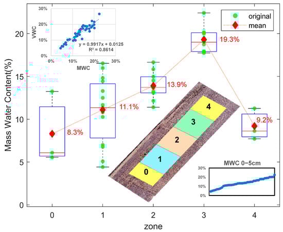 The soil samples were collected on-site and dried using an oven to obtain the true value for the soil moisture level. The calculated VWC and MWC exhibited good consistency (with an R2 of 0.86); thus, MWC was selected for the model validation in this study, as shown in Figure 10. The green dots represent the original sampled values, whereas the red dots represent the mean. The mean surface MWCs of the three experimental groups were 11.1%, 13.9%, and 19.3%, respectively, whereas the surface MWCs of the two environmental control groups were 8.3% and 9.2%. The MWC distribution is displayed in ascending order in the lower right corner of the graph.