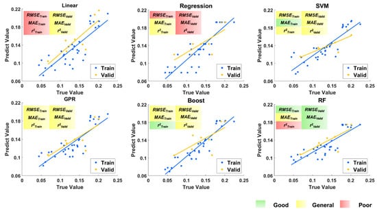The statistical results for the regression models fitted with the training and validation sets obtained using different input features are shown in Table 3. The statistical results are represented by different colors to indicate their advantages and disadvantages, with green, yellow, and red representing the best, medium, and worst.