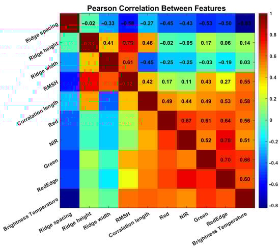 The results of Pearson correlations between features are shown in Figure 13. There was a generally moderate to strong positive correlation among spectral features, indicating that these bands might have overlapping information in their measurements. The correlation patterns between ridge features (spacing, height, and width) and spectral features were inconsistent, with some showing positive correlations and others showing negative correlations. Features with weak correlations with brightness temperature (such as ridge width) might have limited contributions in predicting brightness temperature.