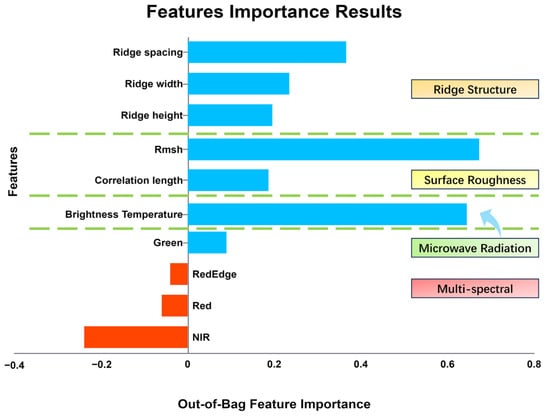 Feature importance is used to evaluate the importance of each input feature (predictor variable) in the random forest model, and the variable importance score is calculated through permutation testing, which can assist in feature selection. The results indicate that the passive microwave radiation brightness temperature and surface roughness contributed significantly to the accuracy of the training model, which is consistent with prior knowledge [51,52]. The parameters of the ridge structure also had a certain impact on the regression results of the soil moisture, and the impact of different multispectral bands on the regression results was relatively small, even negative.