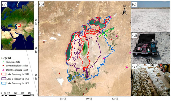 Related images of the study area: (a) the location of the study area; (b) the study area; (c,d) pictures of sampling sites; (e) picture of collected soil samples.