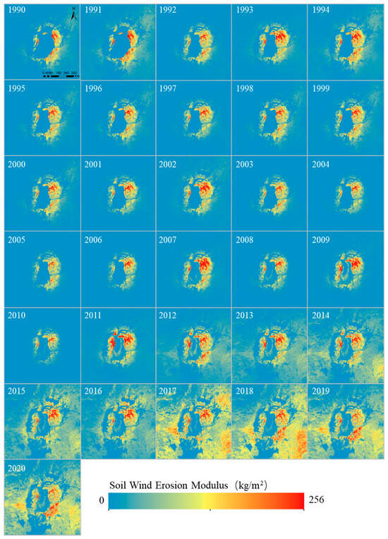 Spatial distribution of annual soil wind erosion modulus from 1990 to 2020.