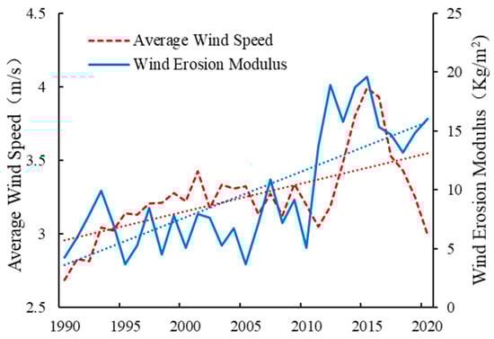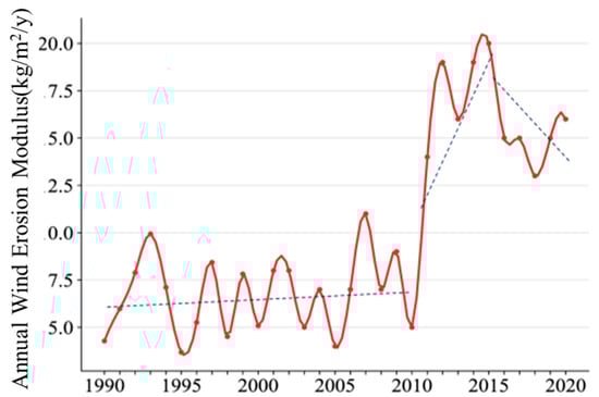 Annual changes in wind erosion modulus from 1990 to 2020.