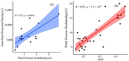 Validation of the simulated soil wind erosion modulus. (a) Relationship between observed dust flux and simulated soil wind erosion modulus at monitoring sites (2000–2005); (b) correlation between annual mean AOD and simulated soil wind erosion modulus (1990–2020).