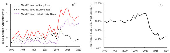 (a) The curve of wind-erosion volume variation inside and outside the lake basin. (b) Aral Sea Basin’s contribution to total wind erosion.
