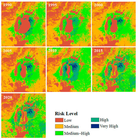 Soil wind-erosion risk level map of the study area from 1990 to 2020.