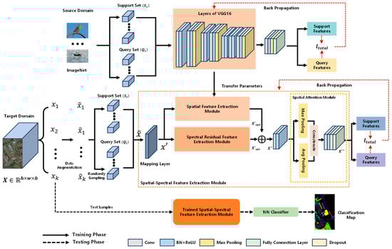 As illustrated in Figure 1, the proposed method comprises two main phases: few-shot pre-training on the source and target domain datasets, and testing on the remaining samples in the target-domain dataset. The pre-training phase first utilizes the source-domain dataset to learn transferable knowledge from the source classes. However, given the rich spatial information inherent in ImageNet images, the features learned during source-domain training may only be partially transferable to the target task. Consequently, the model parameters obtained from source-domain training initialize the weights of the spatial–spectral feature extraction module for the target domain, aiming to enhance knowledge transfer effectiveness. During the testing phase, labeled and unlabeled samples from the HSI dataset are sequentially input to the mapping layer and the pre-trained spatial–spectral feature extraction module to generate fused embedding features. A nearest neighbors (NN) classifier is then trained using the few labeled samples and employed to predict the unlabeled samples. The trained spatial–spectral feature extraction module clusters intra-class samples tightly while distancing inter-class samples in the embedding space. Subsequently, the trained NN classifier leverages this discriminative embedding space to classify unlabeled samples through comparative analysis. Finally, classification maps for all unlabeled samples are generated to evaluate the method’s effectiveness.