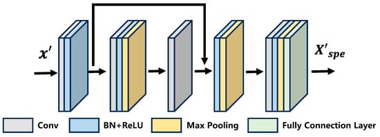 The spatial feature extraction module leverages a transfer learning model pre-trained on ImageNet, providing robust two-dimensional spatial feature representations. To effectively process the continuous spectral bands (dozens to hundreds) characteristic of HSIs, a dedicated spectral residual feature network utilizing convolutional operations is introduced for the spectral dimension. As depicted in Figure 2, this network architecture comprises convolutional layers, spectral residual blocks, and a fully connected (FC) layer. The initial convolutional layer processes the input band vector to generate feature vectors. These vectors are subsequently fed into the spectral residual block. Crucially, padding is applied within each convolutional layer to maintain feature dimensionality, ensuring the output size matches the input. Following the spectral residual processing, a final convolutional layer further refines the feature representation. Each convolutional operation is followed by batch normalization (BN) and a ReLU activation function, enhancing training stability and accelerating convergence. Finally, a fully connected layer with 100 units produces the extracted spectral features, denoted as .