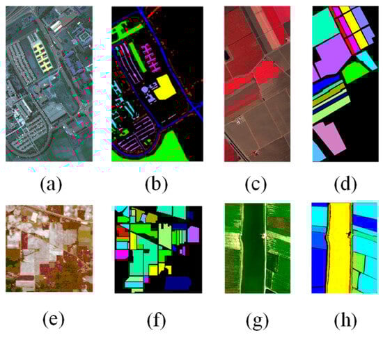 The false-color images and ground-truth maps. (a,b): Pavia University. (c,d): Salinas. (e,f): Indian Pines. (g,h): LongKou.