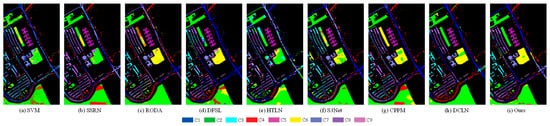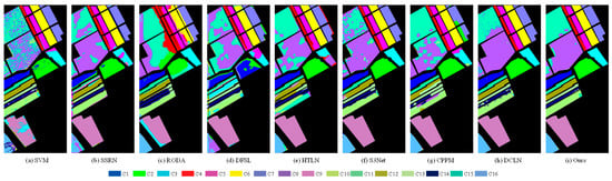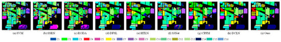 The visual classification maps generated by a variety of methods across the four datasets are depicted in Figure 4, Figure 5, Figure 6 and Figure 7. A comparative analysis reveals that few-shot methods, including DFSL, S3Net, DCLN, and our proposed approach, yield purer and smoother classification maps compared to other methodologies. The SVM classification maps exhibit numerous speckles across many regions and display relatively blurred boundaries between different categories, indicating that SVM, with its simplistic structure, performs poorly when confronted with small sample challenges. While the RODA classification maps are comparatively clearer than those of SVM, they remain less than satisfactory. This observation suggests that data augmentation strategies can partially mitigate the impact of the small sample crisis. However, since the information primarily derives from limited labeled samples, model stability is susceptible to the influence of randomly sampled training data. The SSRN classification maps demonstrate poor results, potentially due to constraints in data volume. Although the classification maps from the few-shot models are not without imperfections, the results are deemed acceptable given the scarcity of training samples. For the Pavia University dataset, our proposed method accurately identifies almost all pixels in the “Gravel,” “Metal-sheets,” “Bare-soil,” and “Bitumen” (C3, C5, C6, and C7) categories. Their boundary clarity is significantly better than that of SVM and SSRN, reflecting the strong representation power of the migrated spatial features on heterogeneous objects. CPPM’s misjudgment of the “Bare-soil” class (C6) reveals the limitations of simple contrastive learning for spectral confusion scenes, while DTCLN corrects such errors through spectral residuals. The “Lettuce” classes (C11–C14) in Salinas show large areas of confusion in S3Net, while DTCLN maintains 98.20% accuracy, thanks to the noise injection of the spectral enhancement module that improves the model’s robustness to band shifts. With only 200 samples in the IP “Wheat” class (C13), DTCLN still achieves 99.14% accuracy, proving that under the hybrid loss constraint, the model avoids overfitting to the minority class.