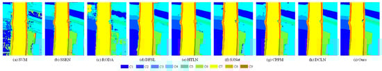 In this experiment, several state-of-the-art algorithms were employed for comparison, including the supervised machine learning method SVM [14], the 3D conv-based method SSRN [22], the data augmentation method RODA [24], a heterogeneous transfer learning network (HTLN) [36], the few-shot learning methods DFSL [23] and S3Net [49], deep cross-domain few-shot learning for hyperspectral image classification (DCLN) [47], and enhancing a contrastive learning with positive pair mining network (CPPM) [54] to verify the validity of the proposed method. Applying uniform evaluation criteria for SVM, five randomly selected labeled samples per class served as training data. All benchmark methods underwent identical training–validation–testing procedures on consistent datasets.
