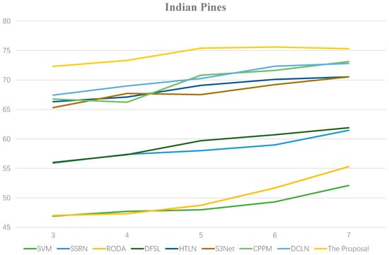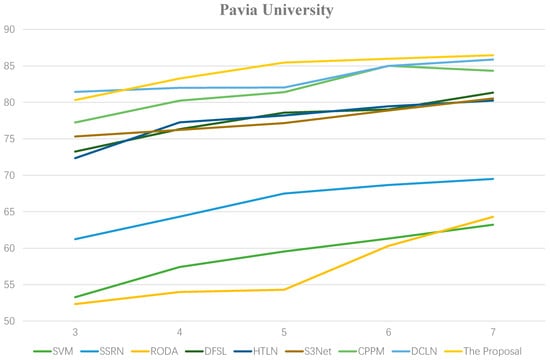 To explore the model’s generalization capabilities with very few labeled samples, we conducted supplementary experiments in settings with 3–7 samples/class. As shown in Figure 8, Figure 9, Figure 10 and Figure 11, the OAs of all methods show a steady upward trend with increasing number of available labels, consistent with the common belief that richer samples lead to better performance. Within this range, our method achieves relatively high OAs in most cases, demonstrating its good adaptability to changes in sample size. Furthermore, even with the most scarce samples (three/class), the OA remains competitive, suggesting the potential advantages of the proposed strategy in extremely low-sample scenarios.