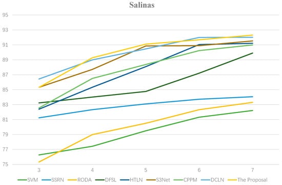 Classification accuracies (%) generated by different numbers of labeled samples from the Salinas dataset.