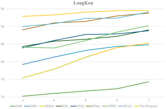 Classification accuracies (%) generated by different numbers of labeled samples from the LongKou dataset.