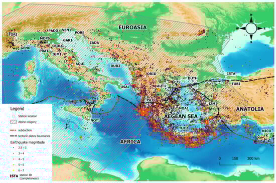 Selected stations are located in Europe, particularly in its southern part (Figure 1), in areas characterized by seismic activity [34]. According to data contained in the U.S. Geological Survey (USGS) Earthquake Catalog [35], over 18,000 earthquakes with magnitudes above 2.5 were recorded in the considered region and its surroundings in the period 2006–2024. At the same time, only about 2% of the earthquakes had a magnitude above 5. The region is dominated by earthquakes with magnitudes between 3 and 4. The earthquakes usually occur here at a depth of up to 100 m (approximately 97% of the presented earthquakes). Furthermore, stations such as PAT0, NOA1, IZMI, and TUC2 are located on the Aegean microplate. NOT1 is located on the African tectonic plate, while NICO is located on the Anatolian microplate. The remaining stations are located on the Eurasian plate, with TUBI located on the boundary of the Eurasian and Anatolian plates. From the quite large set of stations’ position data, those that were additionally classified as stations belonging to the European EUREF Permanent Network (EPN) were selected, due to their geodetic quality resulting from additional standards for the foundation and equipment of stations defined by EPN. However, the analyses did not use the network solutions of station positions from EPN. Finally, 25 stations were selected for analysis, which are characterized by a data length of at least 8 years and data completeness above 94%. The average length of missing data is 3%. Due to the long data gaps, some time series were shortened at the beginning or at the end, hence accounting for the different start and end dates (Table 1). The length of the analyzed time series ranges from 8.3 years to 27.3 years.
