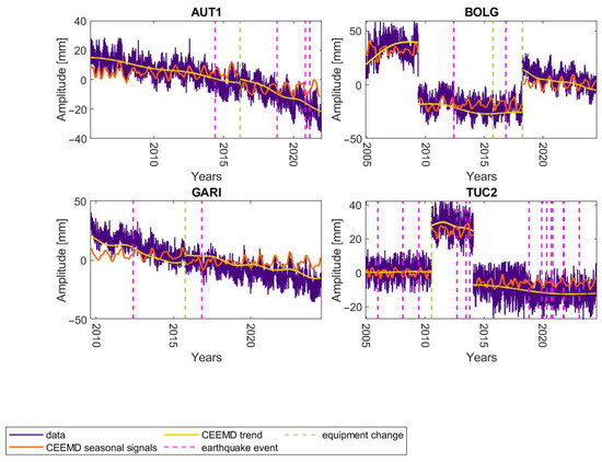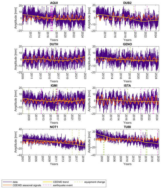 Figure 2 shows the modeled seasonal, semi-annual, and annual signals and the CEEMD trend for the U component, for example, for the time series of stations where no significant discontinuities due to seismic activity or equipment changes were detected. The seasonal signals modeled using the CEEMD method are clearly characterized by variability in time, which has already been shown by Wnęk and Kudas [25,32], while in the case of trends, their local nonlinear character can also be observed. If no earthquake event occurred in the vicinity of the station, then the trends are usually close to linear, e.g., stations: AQUI, GENO, ISTA. In some cases, the determined trend is locally nonlinear, despite the lack of noticed events in specific periods, e.g., stations: NOT1, TUBI, VEN1. It may therefore be the result of unknown or unnoted phenomena [51]. Most often, however, nonlinear changes in the trend occur in the vicinity of earthquakes (e.g., stations DUB2, DUTH, IGMI, TUBI). It can be seen that the curve of the trend modeled by the CEEMD method after the earthquake is close to a logarithmic or exponential function, e.g., DUB2, DUTH, or TUBI stations. This confirms the previous observations [52,53] that the post-seismic relaxation is usually modeled using a combination of these two functions. Moreover, these observed nonlinear trend curves after the earthquake events are consistent with the observations of Heflin et al. [14], who claim that after such an event, the station time series returns to long-term movements after 2–3 years. At the same time, the most problematic situations in interpretation are those when equipment changes and earthquakes occur in small time intervals, e.g., DUB2, IGMI, especially when none of these phenomena cause a significant shift in the time series of the station position. It is worth noting here that discontinuities caused by equipment changes or earthquake occurrence make it difficult to estimate geophysical signals such as uplift rates and seasonal loading signals [54]. At the same time, as Montillet et al. [55] point out, the possible presence of nonlinear post-seismic signals may make it difficult to estimate discontinuities in GPS time series. The lack of significant discontinuity in the time series may also be a consequence of these shifts being too small to be resolved in the noisy signal [51]. Thus, here this may also be a consequence of the assumption made in the NGL service that a close earthquake, which may cause a step, is understood as one that occurs at a distance of 10^(M/2 − 0.79) km from the station, where M is the magnitude of the event [33]. At the same time, as stated in the NGL service, this is an approximation of the radius of the maximum impact of the event, which does not guarantee that a significant offset will be noted in the time series or may be noted for stations at a greater distance [33].
