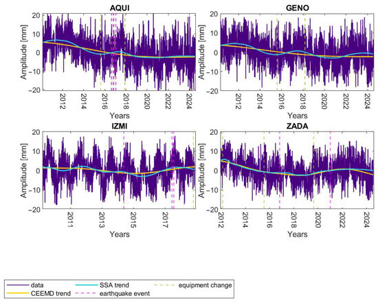 To assess the suitability of the CEEMD method for modeling nonlinear trends, a comparative analysis was performed with nonlinear trends estimated using the SSA method. Figure 4 presents an example comparison of the obtained trends for the AQUI, GENO, IZMI, and ZADA stations. This shows that the trends determined by the SSA method are more nonlinear than the trends estimated by the CEEMD method. However, these nonlinearities are not associated with earthquake occurrence. This is particularly evident in the case of the GENO station, for which no earthquakes were recorded during the period under consideration, and the trend determined by the SSA method is clearly nonlinear. In the case of the AQUI and IZMI stations, the trends modeled by the SSA method are also more pronounced as nonlinear than those modeled by the CEEMD method. However, this nonlinearity occurs not only in the vicinity of earthquakes but also during periods without seismic activity.
