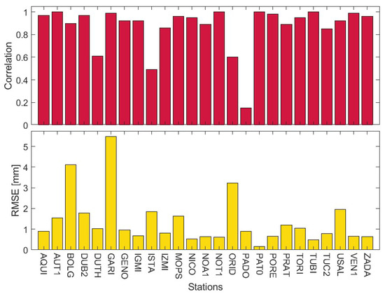 In a comparative analysis of trends estimated by the CEEMD method with those determined by the SSA method, correlation coefficients and RMSE were also determined (Figure 5). In 68% of cases, the correlation coefficients are above 0.90, while in 16% of cases, they are in the range of 0.80 to 0.90. The lowest correlation coefficient values are noted for stations DUTH, ISTA, ORID, and PADO, amounting to 0.61, 0.49, 0.60, and 0.15, respectively. In the case of PADO, the low correlation coefficient value is a consequence of the negative correlation between trends in the period before the discontinuity caused by equipment change. In turn, considering the obtained RMSE values, in 56% of cases, they reach values below 1 mm. The highest RMSE values are noted for the BOLG, GARI, and ORID stations, at 4.11, 5.47, and 3.27, respectively. Only the ORID station has also one of the lowest correlation coefficients. However, for the BOLG and GARI stations, the relatively high RMSE values may be due to the periods for which the trends were estimated. For the BOLG station, trends were estimated for three-time intervals of approximately 4.5, 8, and 6.5 years, and for the GARI station, for two-time intervals of approximately 5.5 and 9.5 years.