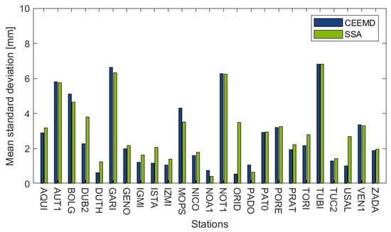 The values of the mean standard deviation determined by the bootstrap method for the trend estimated by the CEEMD and SSA methods (Figure 6) are, in both cases, at the level of approximately 1–3 mm. At the same time, the highest values of the mean standard deviation were noted for the AUT1, GARI, NOT1, and TUBI stations, and they were 5.81, 6.64, 6.28, and 6.81 mm, respectively, for the CEEMD method, and 5.76, 6.32, 6.26, and 6.81 mm, respectively, for the SSA method. In the case of the GARI and TUBI stations, the estimated trends are clearly nonlinear. In the case of the TUBI station, only two earthquake events were noted, but they occurred at the end of the analyzed periods, i.e., in 2014 and 2019. In the case of the GARI station, in the considered period, only one earthquake occurred in 2016, after which a change in the trend is noticeable. Moreover, in the period without events, lasting over 10 years, the determined trend is also nonlinear. In the case of the NOT1 station, there were no events related to earthquakes in a period of almost 15 years, and the determined trend is close to linear but with small local changes. The lowest mean standard deviation values were noted for stations NOA1, PADO, and DUTH, amounting to 0.75, 1.08, and 0.62 mm for the CEEMD method, and 0.43, 0.66, and 1.25 mm for the SSA method, respectively. In these cases, the determined trends are closest to linear, with slopes below 1 mm. The DUTH and PADO stations also had the lowest correlation coefficients between the trend estimated using the CEEMD and SSA methods.