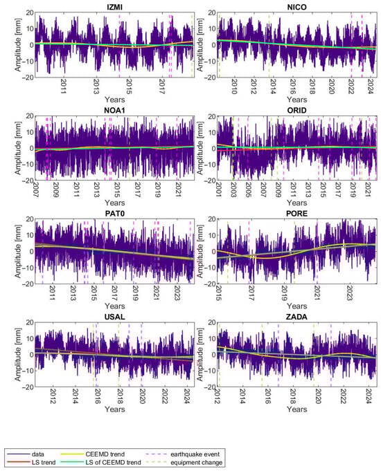 To compare the estimated time-varying trend with the linear one, a least squares (LS) linear trend was also fitted to the trend obtained by CEEMD. Due to the fact that the trends estimated by the CEEMD method do not differ significantly from those estimated by the SSA method, linear fitting was performed only in the case of the CEEMD method. Figure 7 shows the CEEMD trends together with the LS estimated trend. Figure 8 also shows the trends estimated by the LS and CEEMD methods along with fitting the linear trend to the nonlinear CEEMD trend, but for stations where significant discontinuities were noted and the trends were estimated for individual time intervals. Figure 7 and Figure 8 also show the changes in equipment and earthquakes noted near the station, according to the information provided in the NGL service [39].