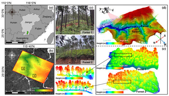 Study area. (a) Geographic location of the study site. (b) Selected forested experimental region. (c) Actual forest environment within the experimental plots. (d) Airborne LiDAR point cloud data acquired over the study area. (e) The two experimental plots used for evaluating the proposed method.