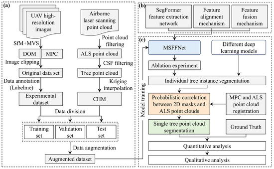 Pipeline of the proposed method. (a) Dataset construction process. (b) Core modules of the tree crown instance segmentation model. (c) Model training, inference, and individual tree point cloud segmentation process.
